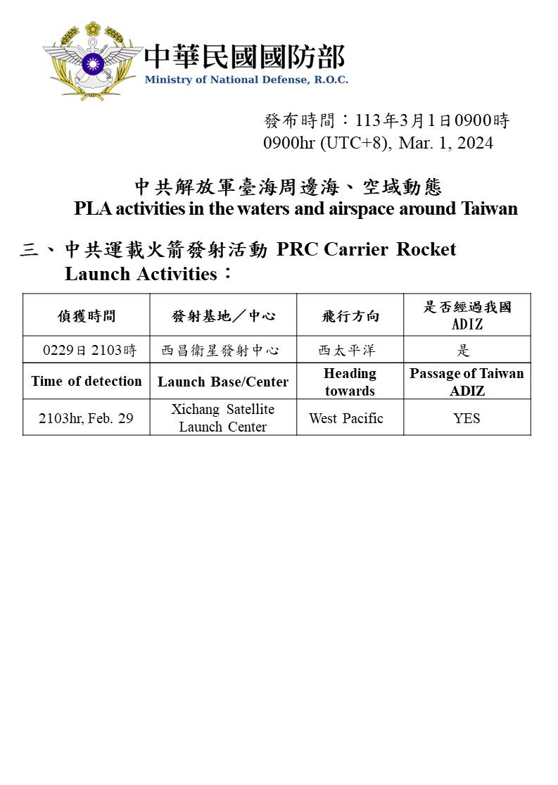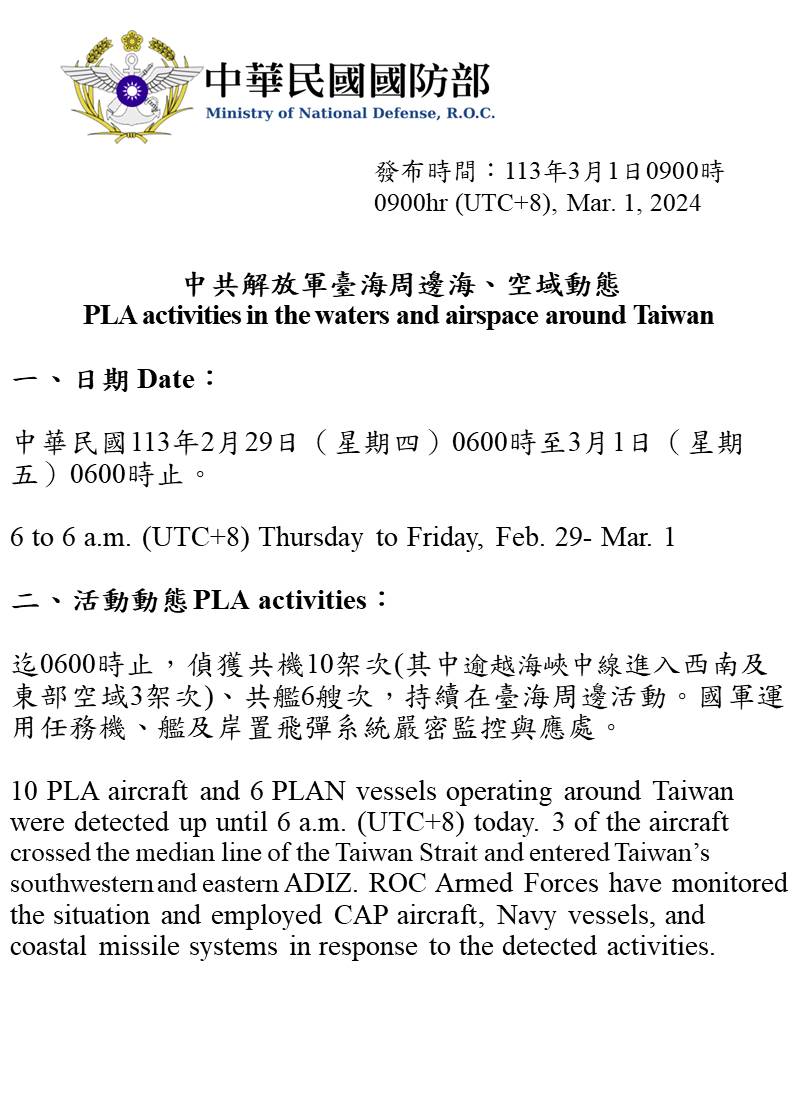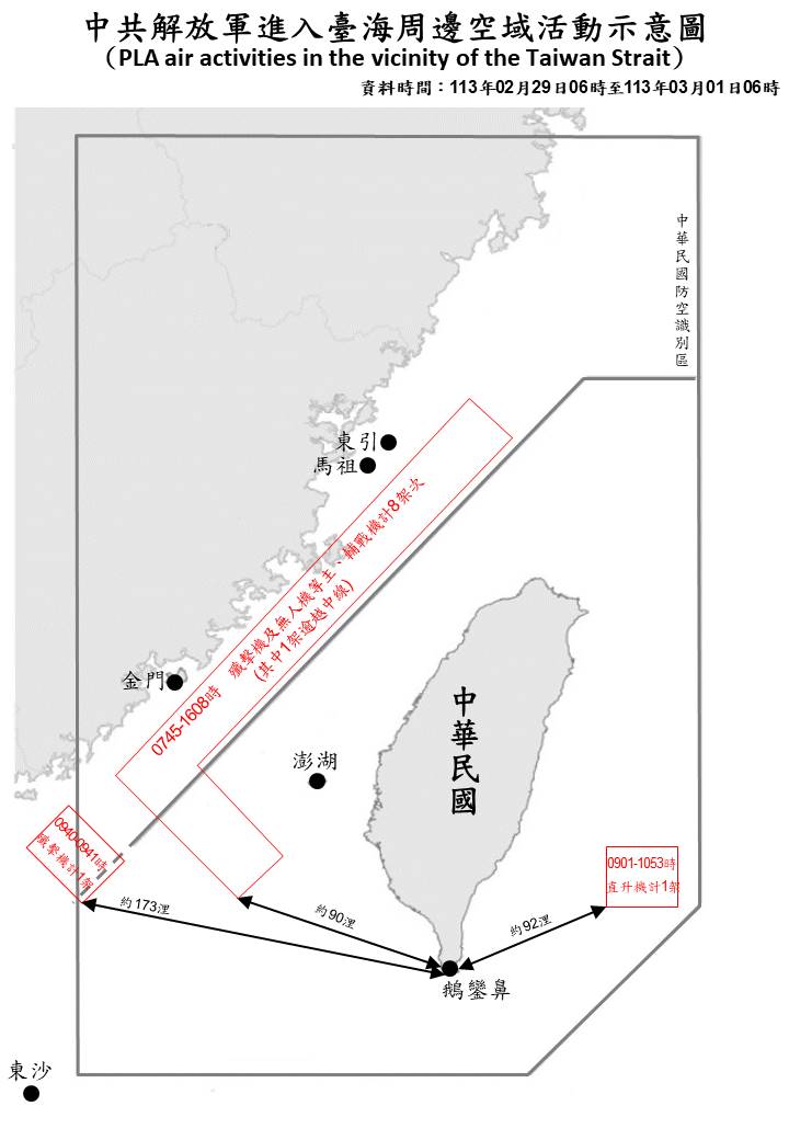 中共解放軍臺海周邊海、空域動態(113年3月1日)