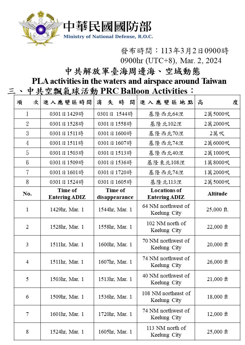 中共解放軍臺海周邊海、空域動態(113年3月2日)