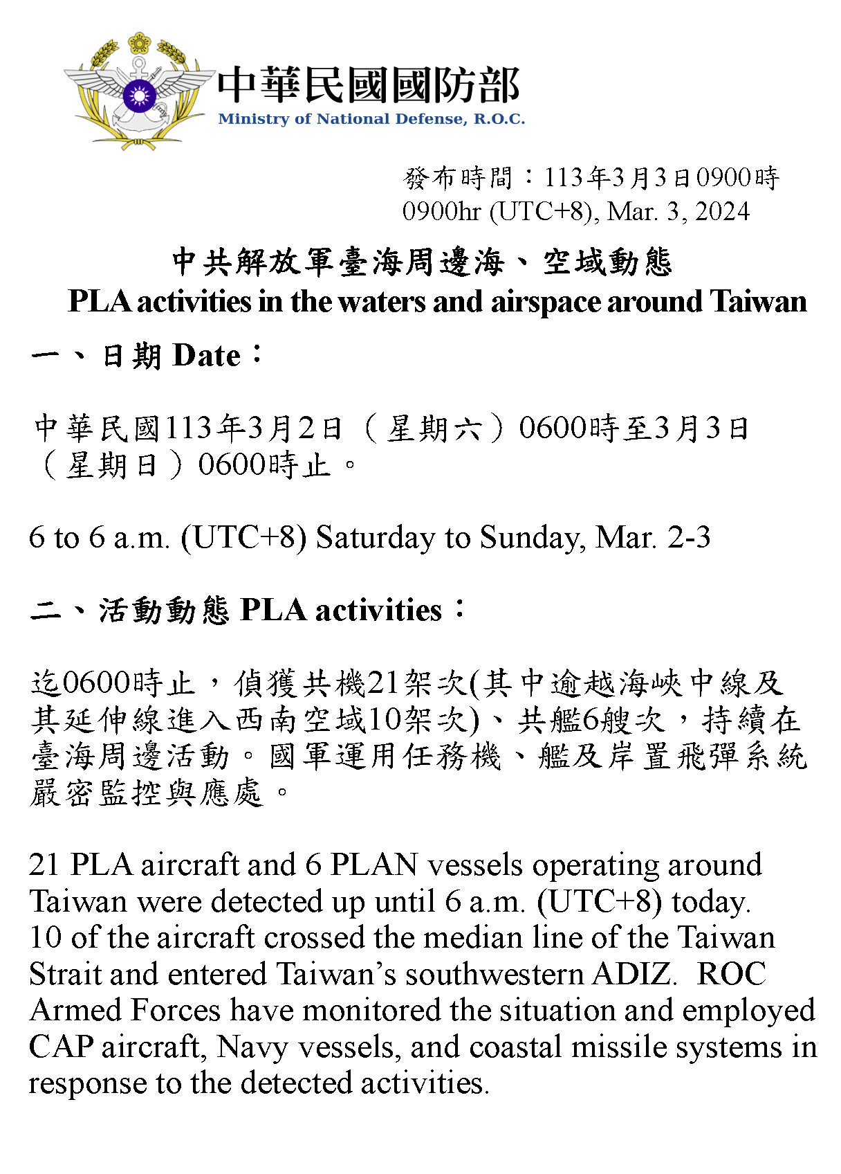 中共解放軍臺海周邊海、空域動態(113年3月3日)