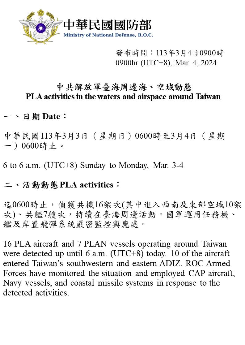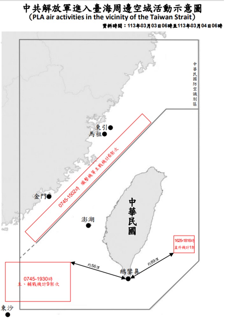 中共解放軍臺海周邊海、空域動態(113年3月4日)