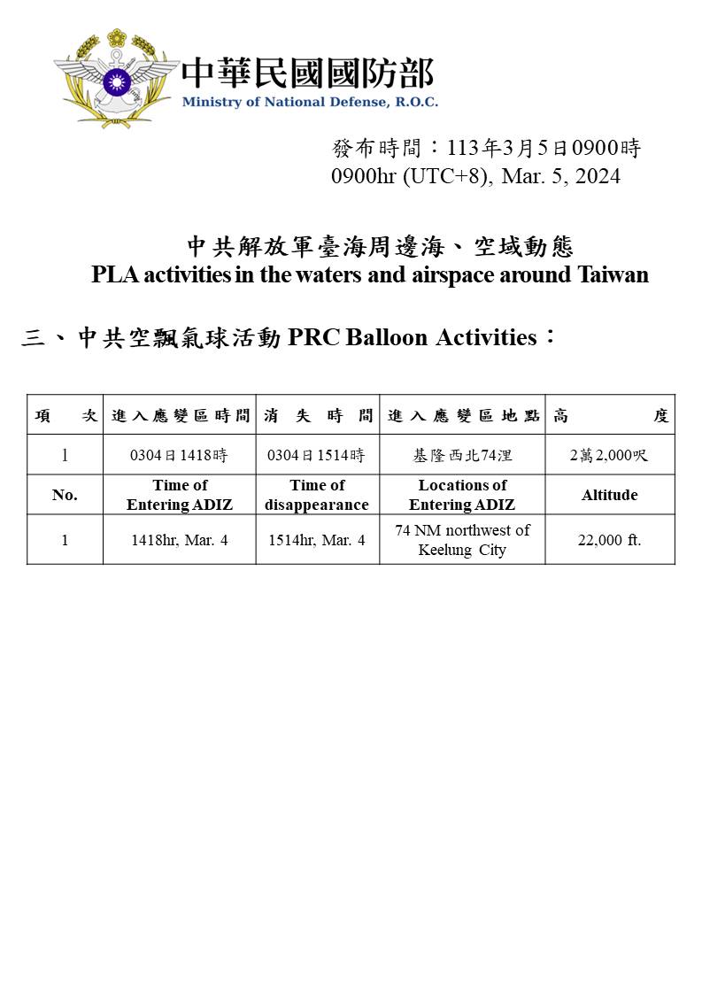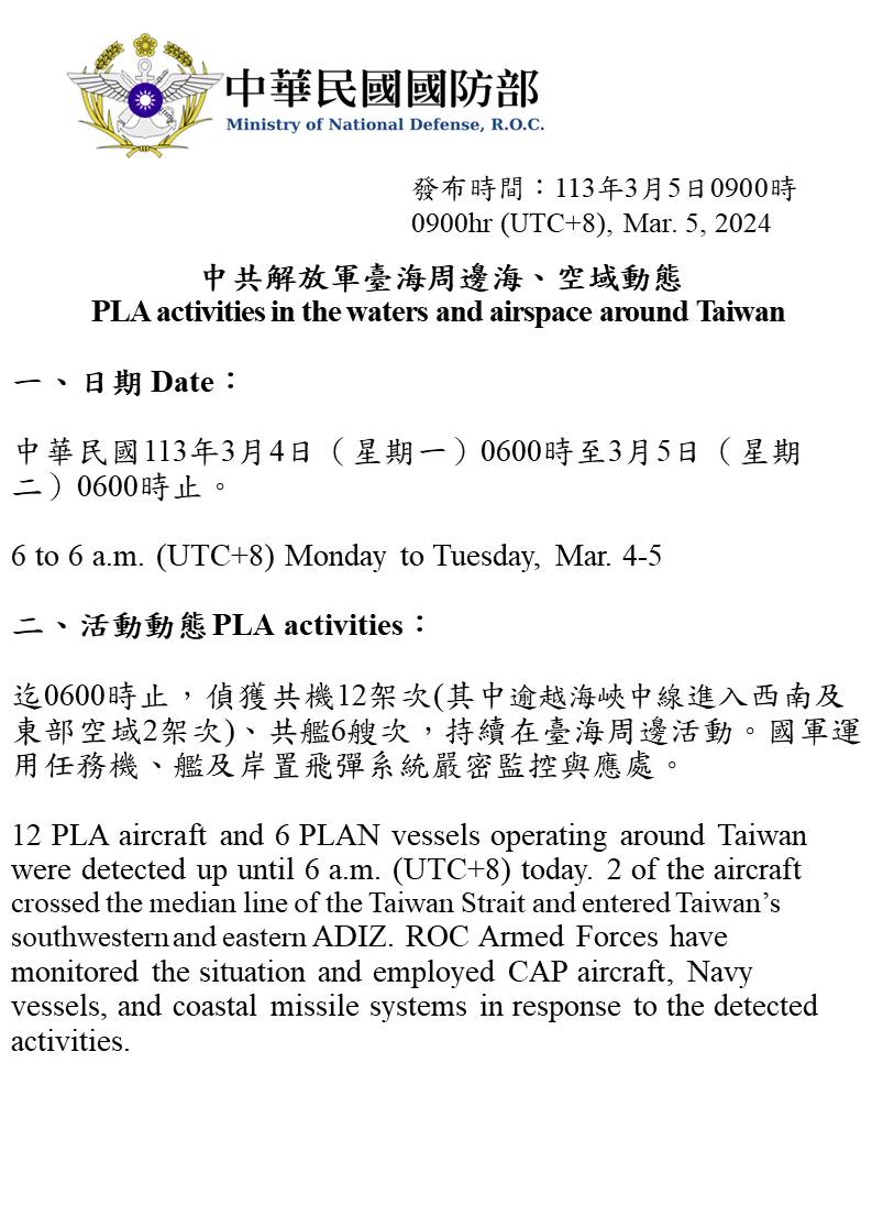 中共解放軍臺海周邊海、空域動態(113年3月5日)
