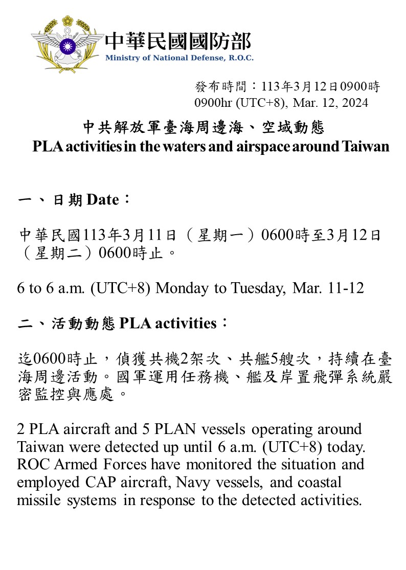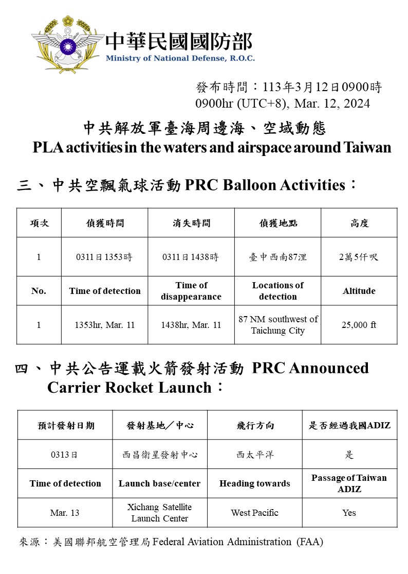 中共解放軍臺海周邊海、空域動態(113年3月12日)