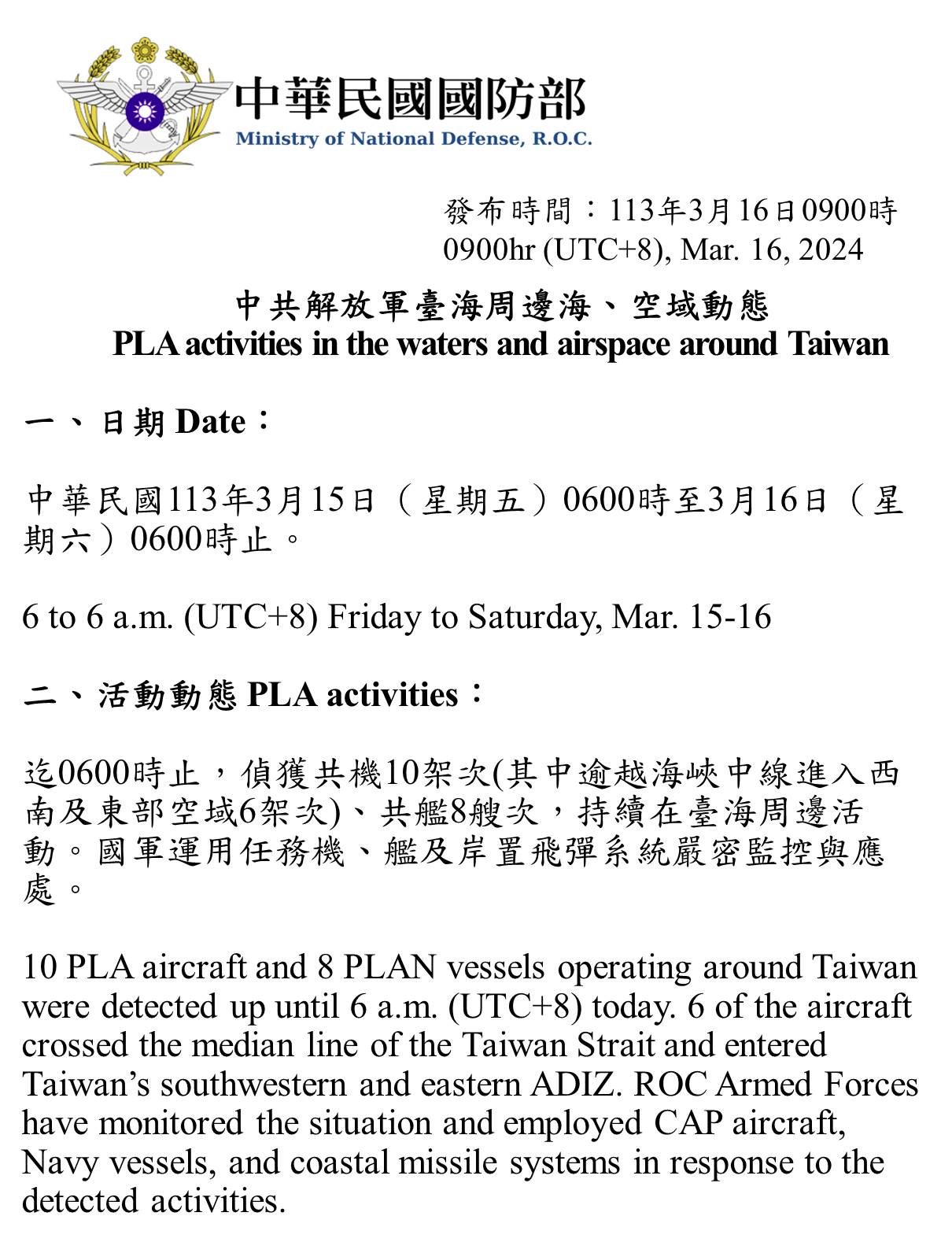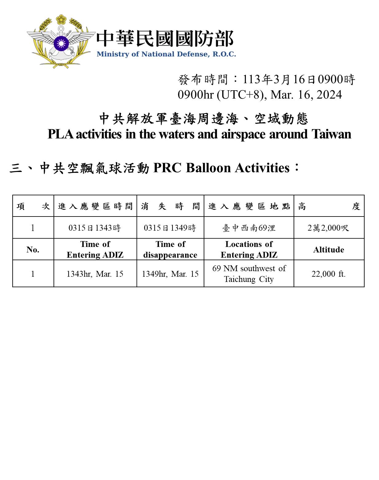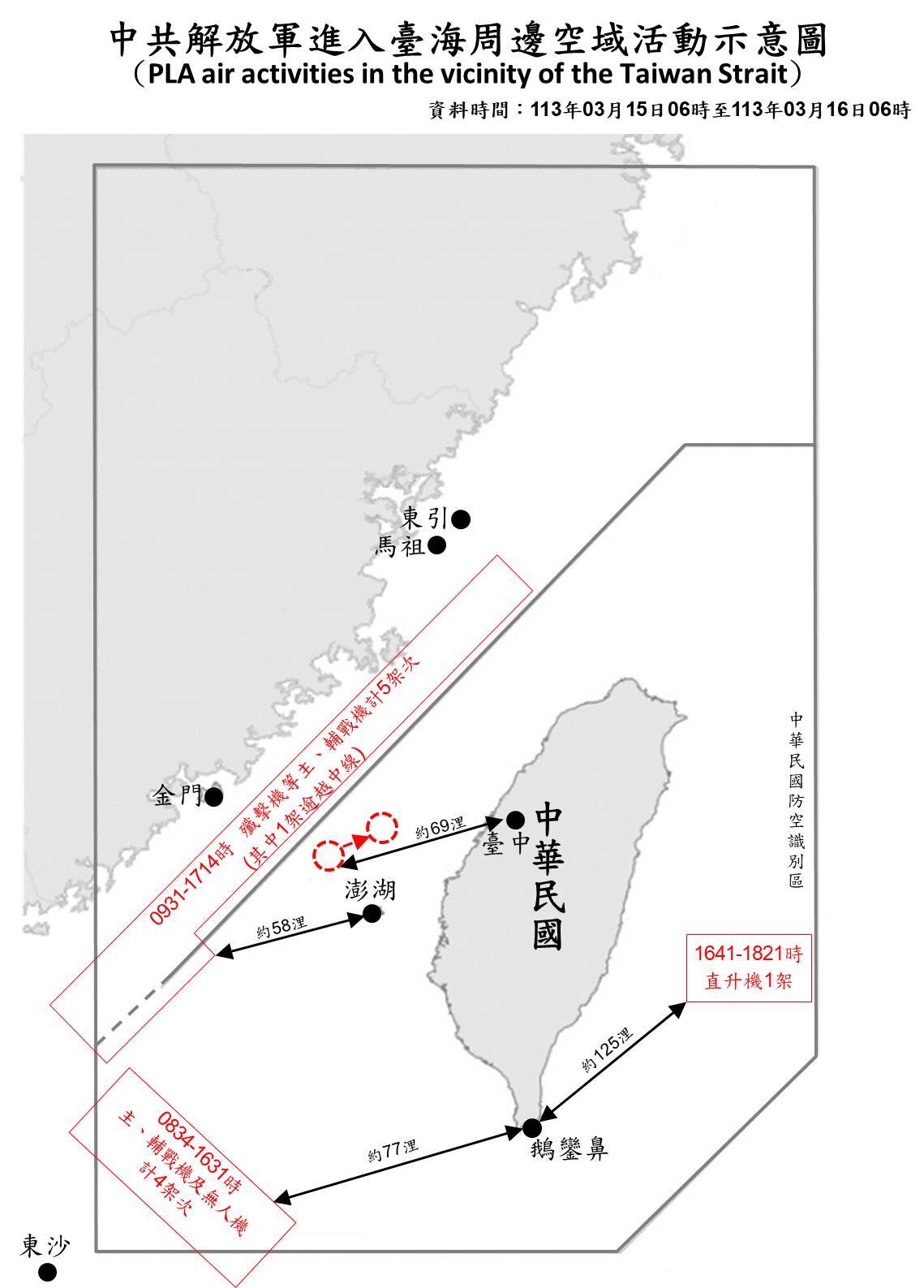 中共解放軍臺海周邊海、空域動態(113年3月16日)