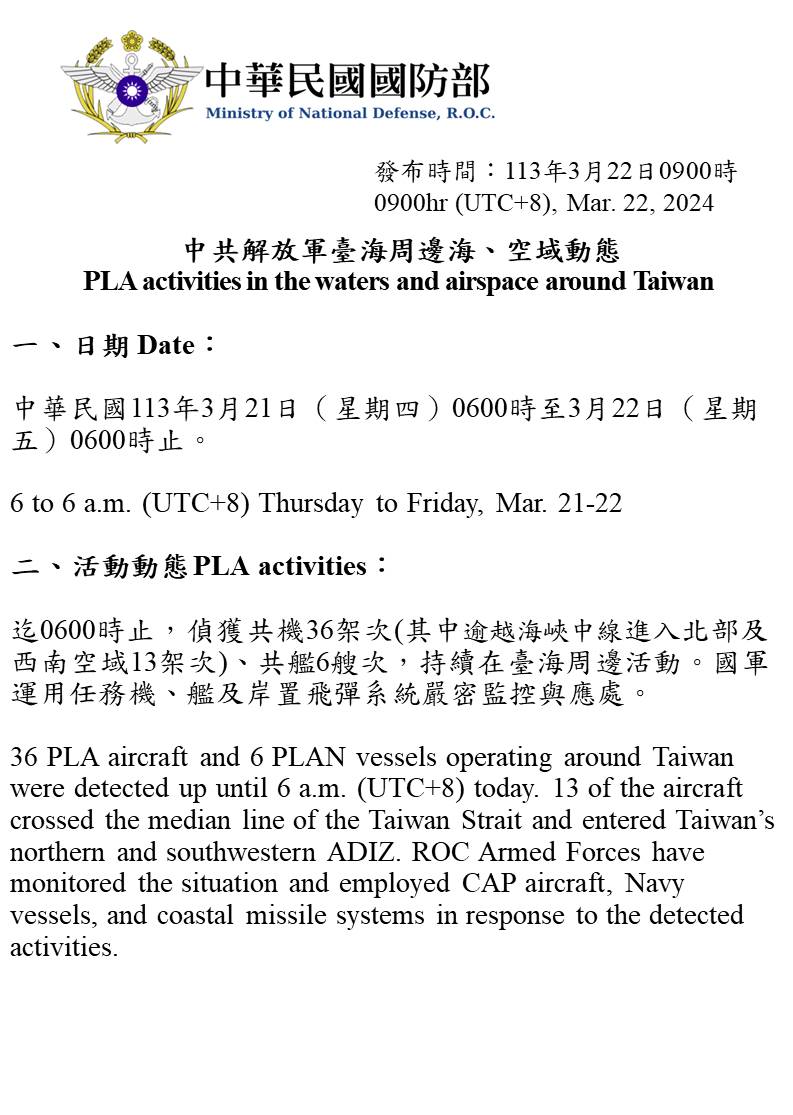中共解放軍臺海周邊海、空域動態(113年3月22日)