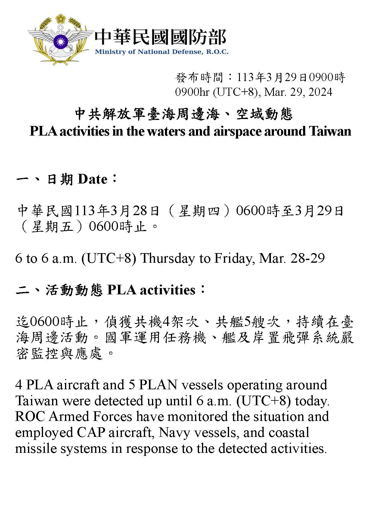 中共解放軍臺海周邊海、空域動態(113年3月29日)