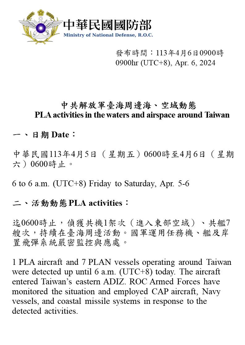 中共解放軍臺海周邊海、空域動態(113年4月6日)