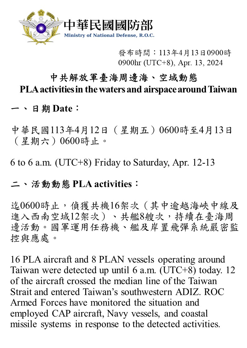 中共解放軍臺海周邊海、空域動態(113年4月13日)