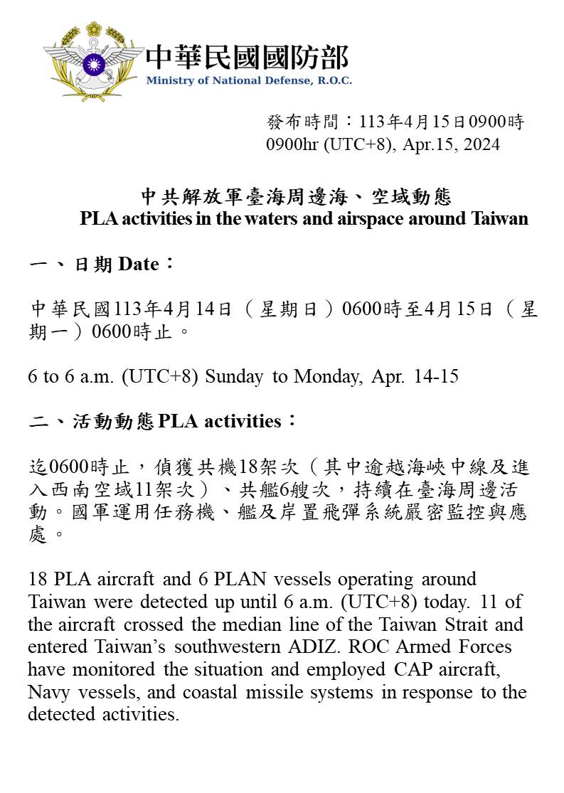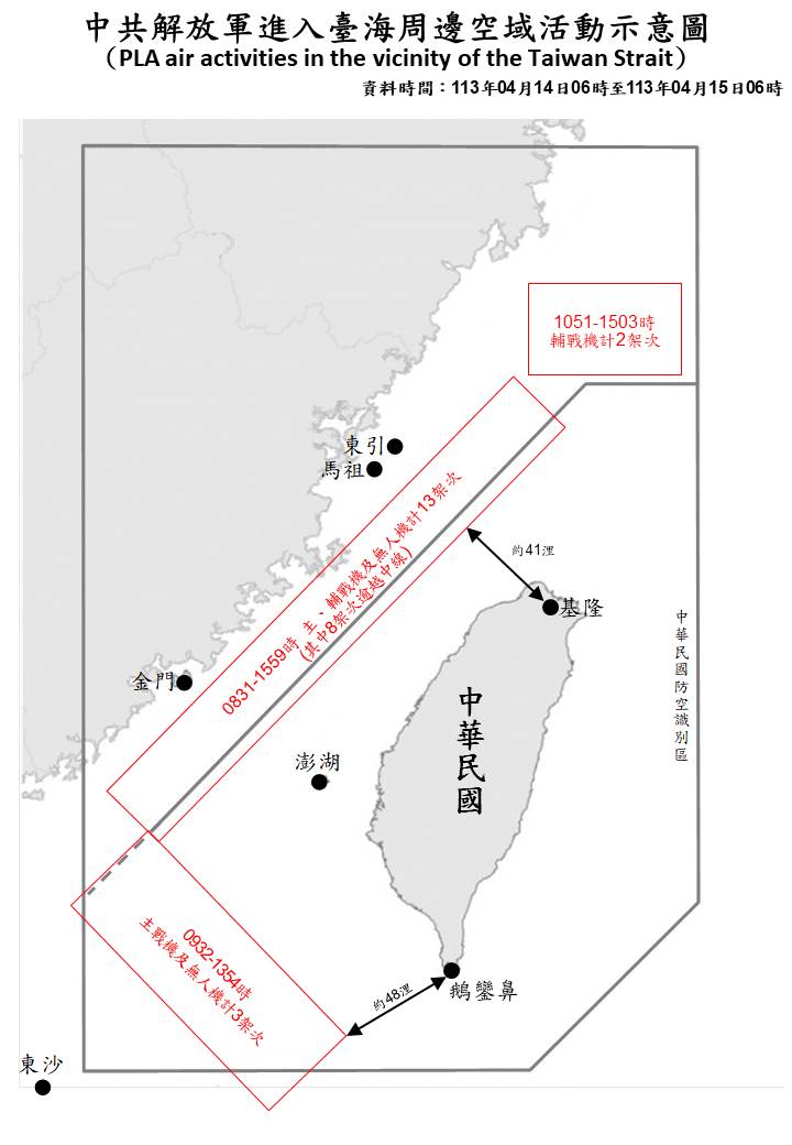 中共解放軍臺海周邊海、空域動態(113年4月15日)