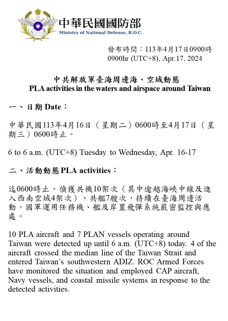 中共解放軍臺海周邊海、空域動態(113年4月17日)