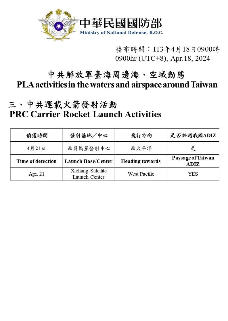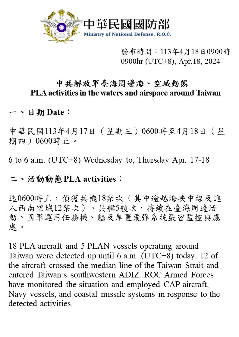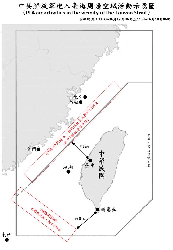 中共解放軍臺海周邊海、空域動態(113年4月18日)