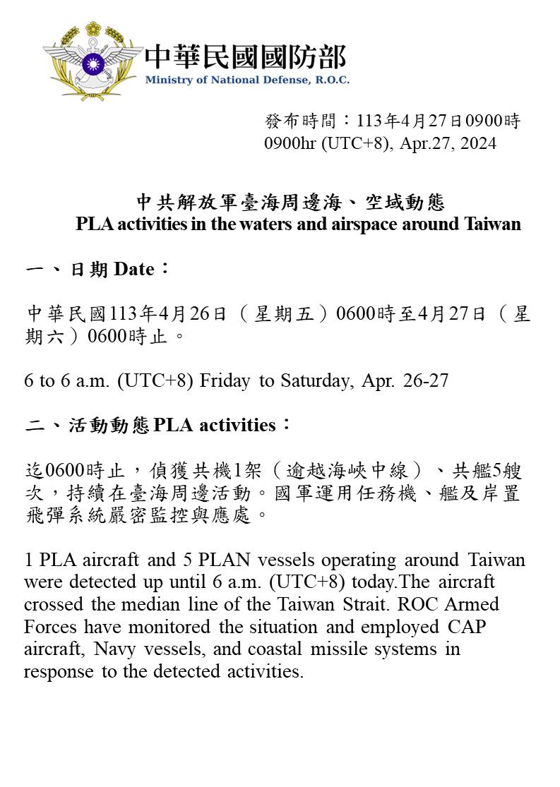 中共解放軍臺海周邊海、空域動態(113年4月27日)