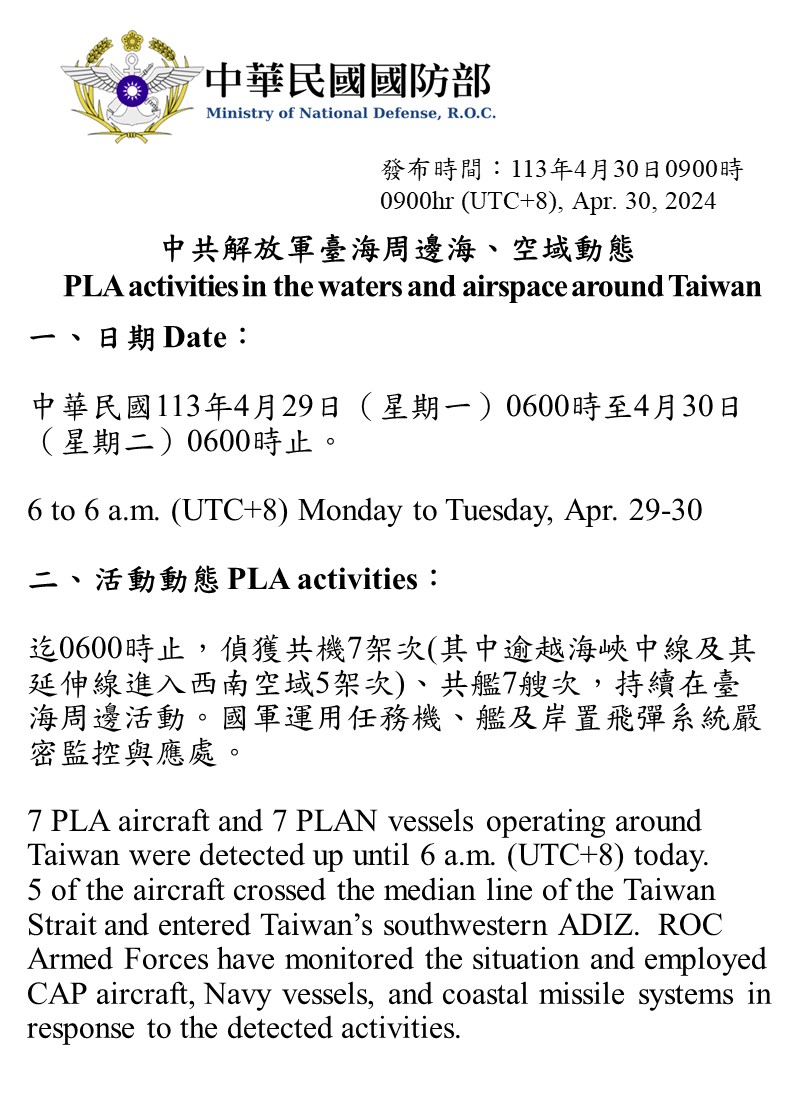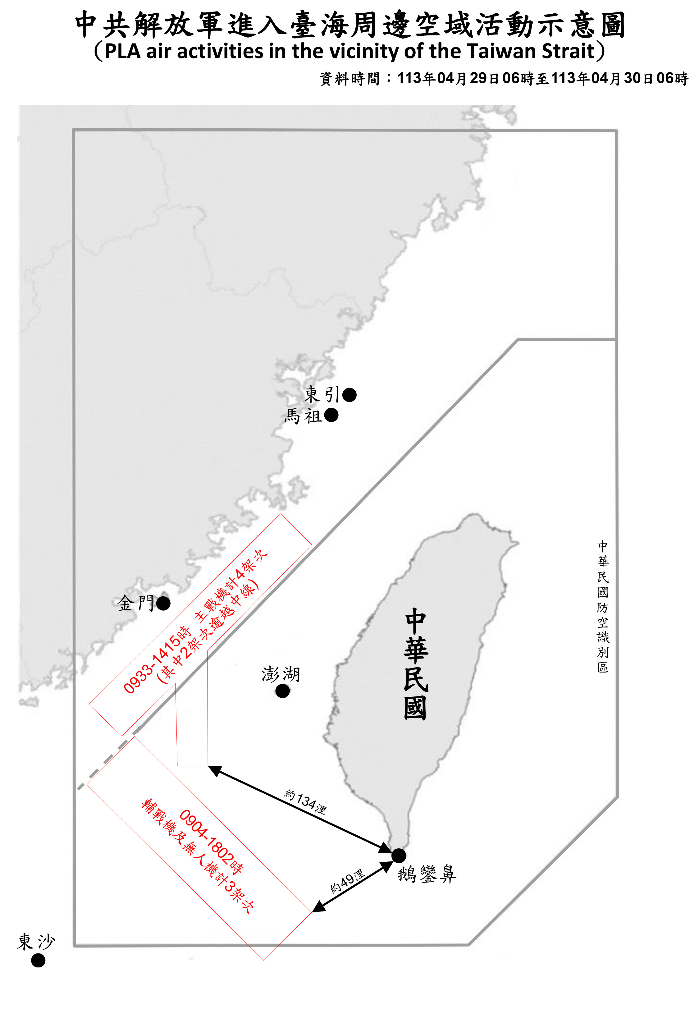中共解放軍臺海周邊海、空域動態(113年4月30日)