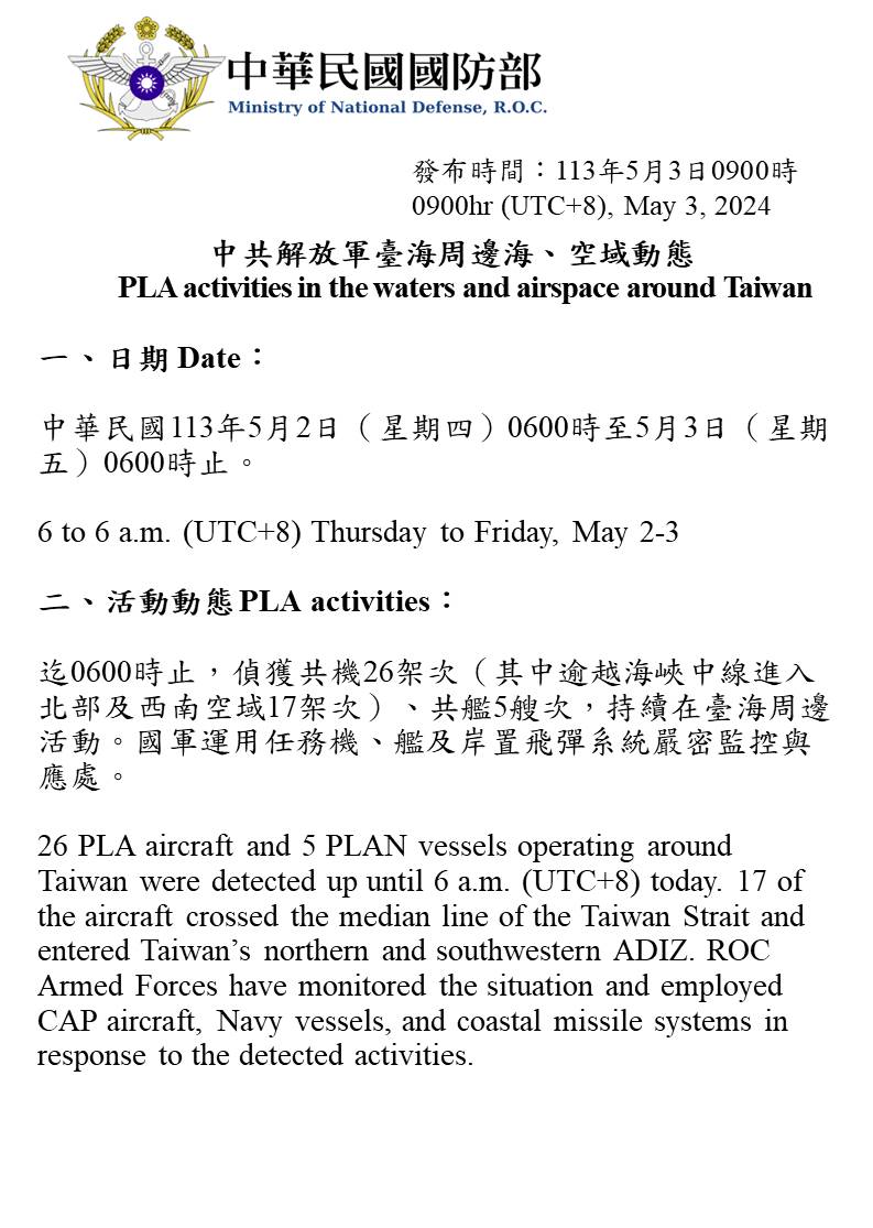 中共解放軍臺海周邊海、空域動態(113年5月3日)