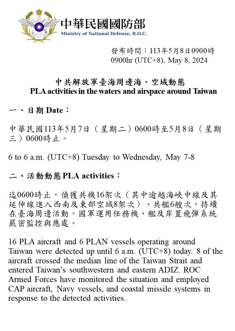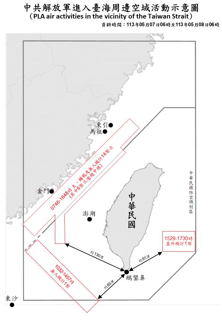 中共解放軍臺海周邊海、空域動態(113年5月8日)