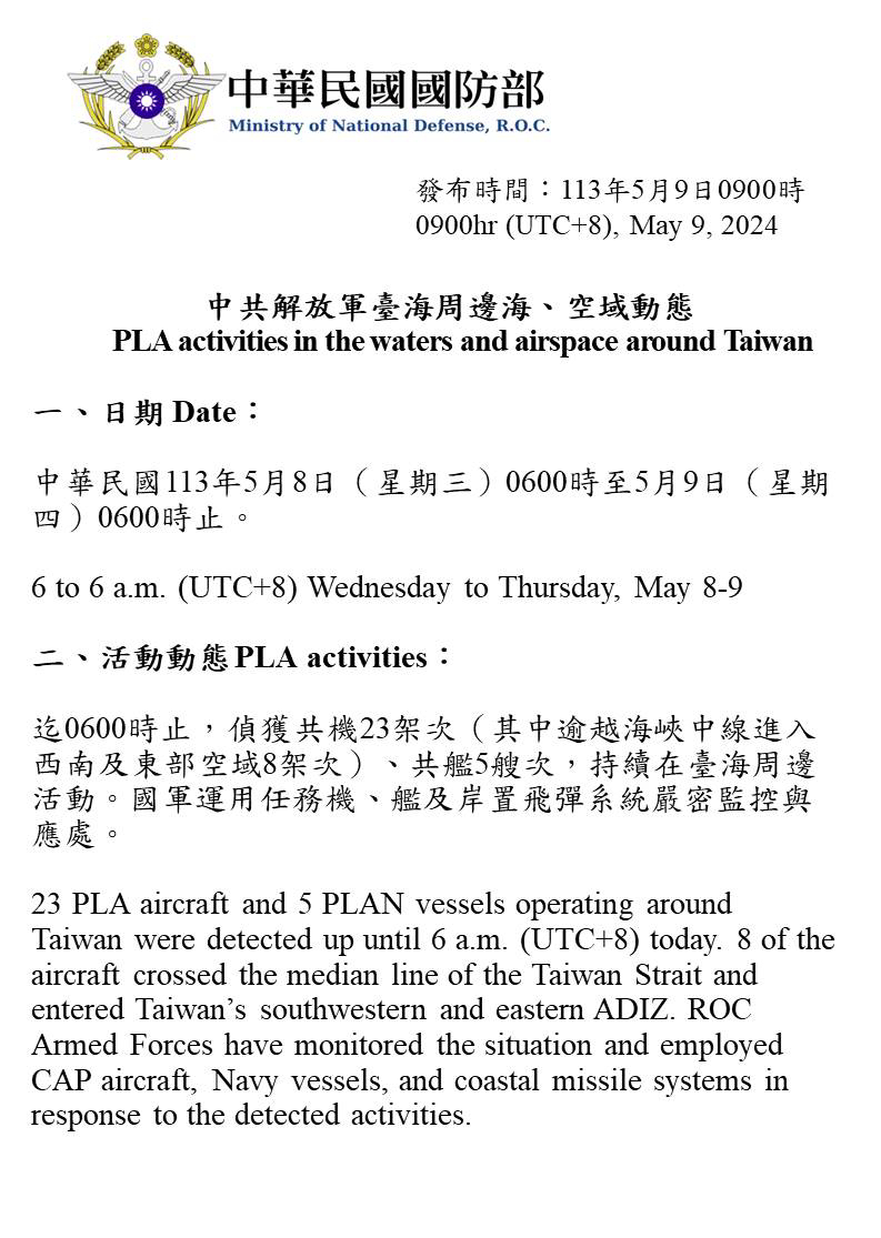 中共解放軍臺海周邊海、空域動態(113年5月9日)