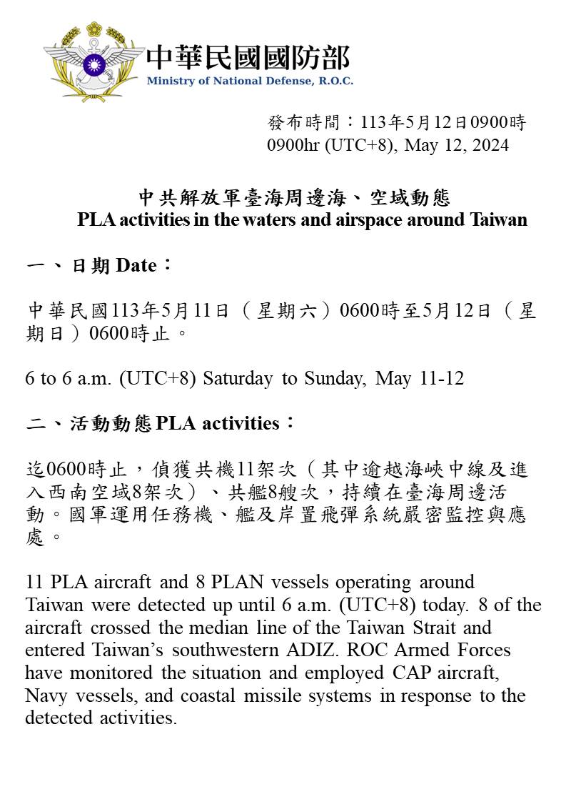 中共解放軍臺海周邊海、空域動態(113年5月12日)