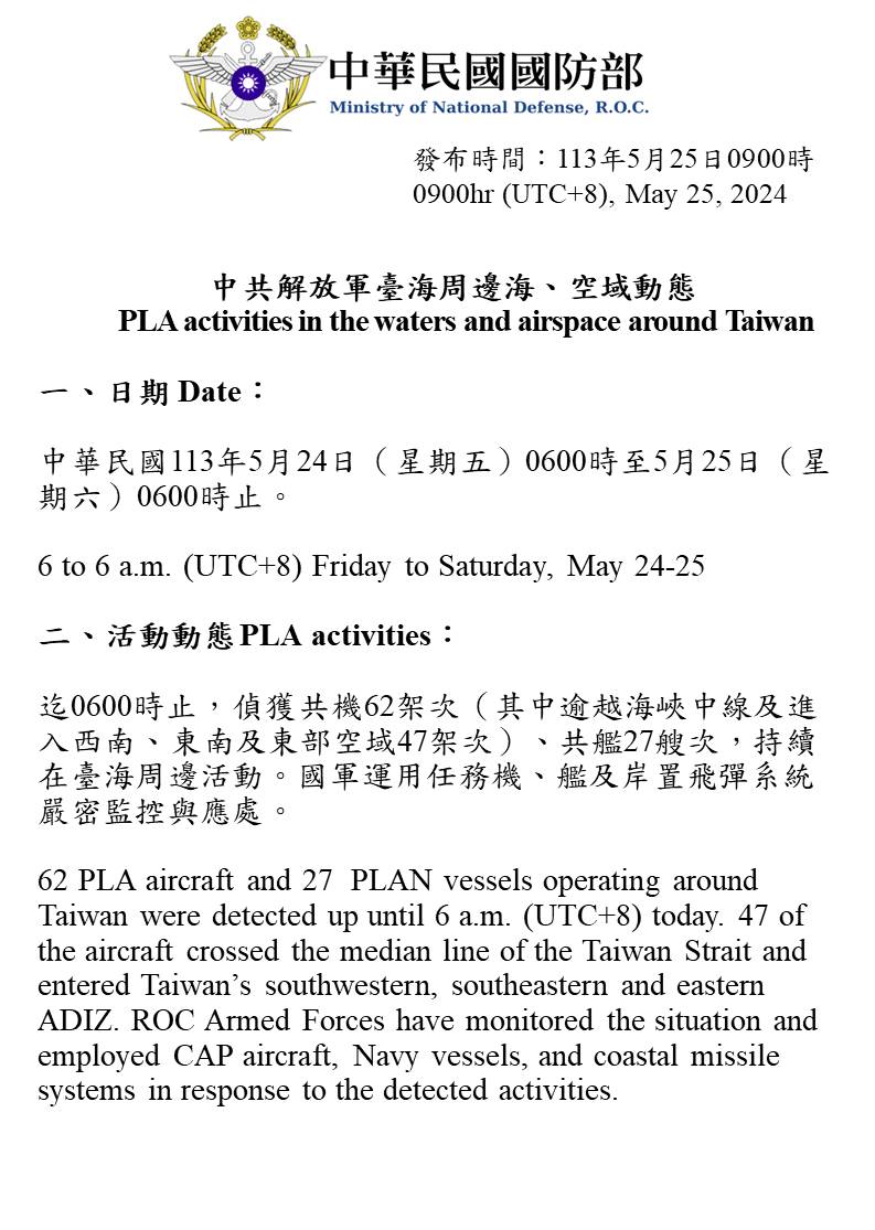 中共解放軍臺海周邊海、空域動態(113年5月25日)