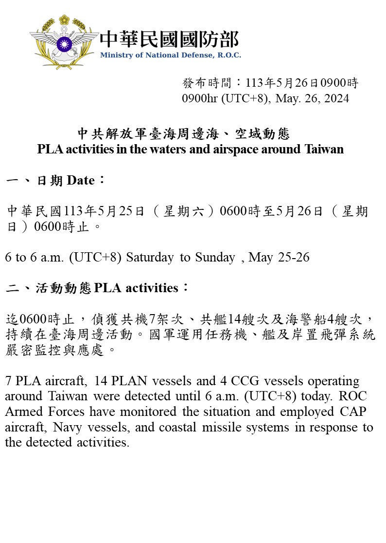 中共解放軍臺海周邊海、空域動態(113年5月26日)