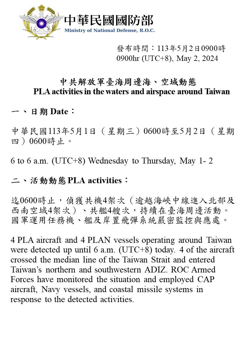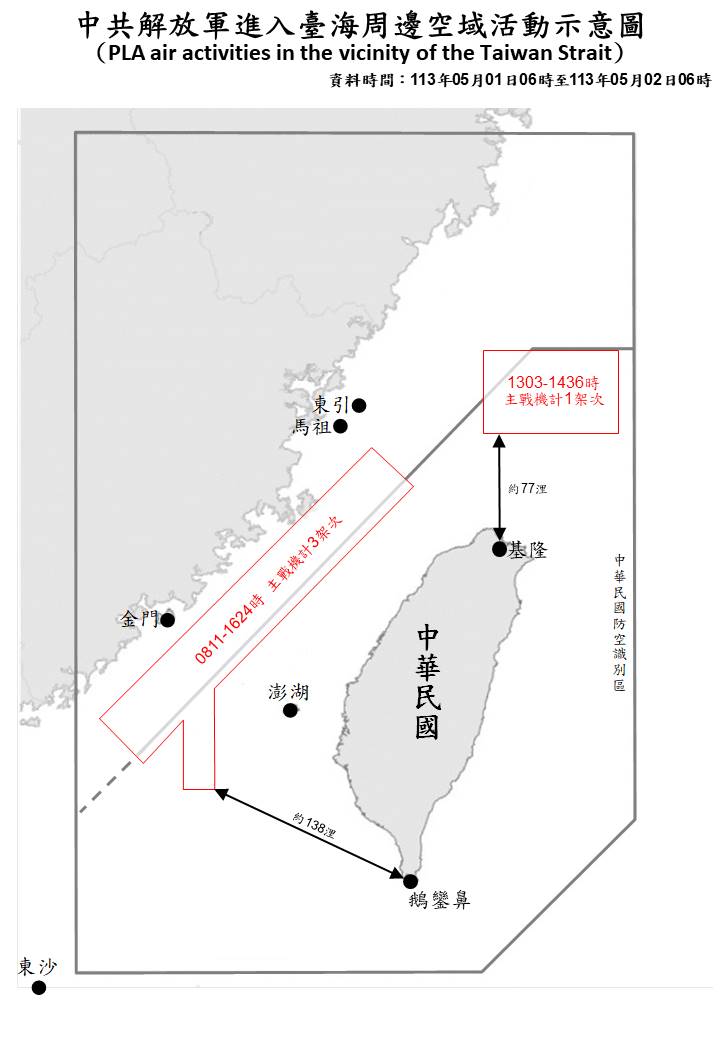 中共解放軍臺海周邊海、空域動態(113年5月1日)