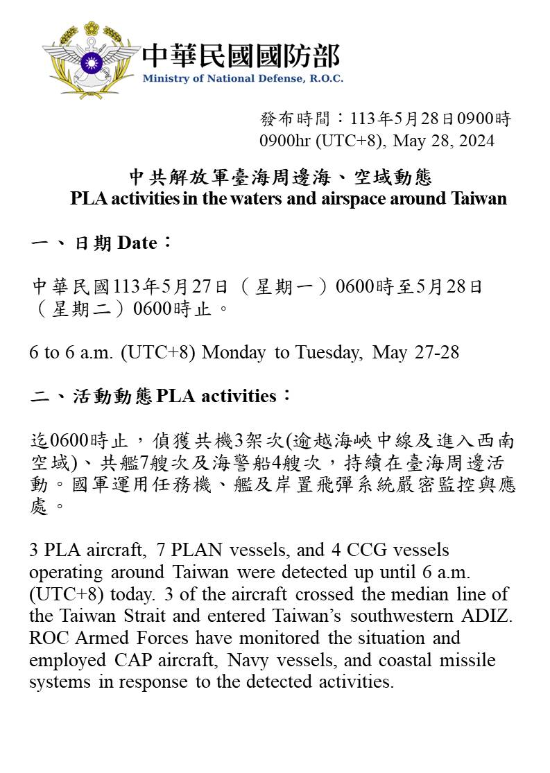 中共解放軍臺海周邊海、空域動態(113年5月28日)