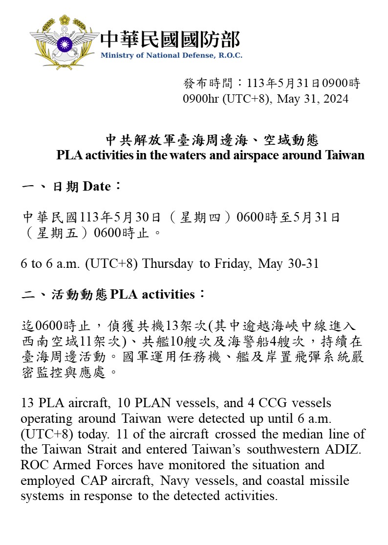 中共解放軍臺海周邊海、空域動態(113年5月31日)