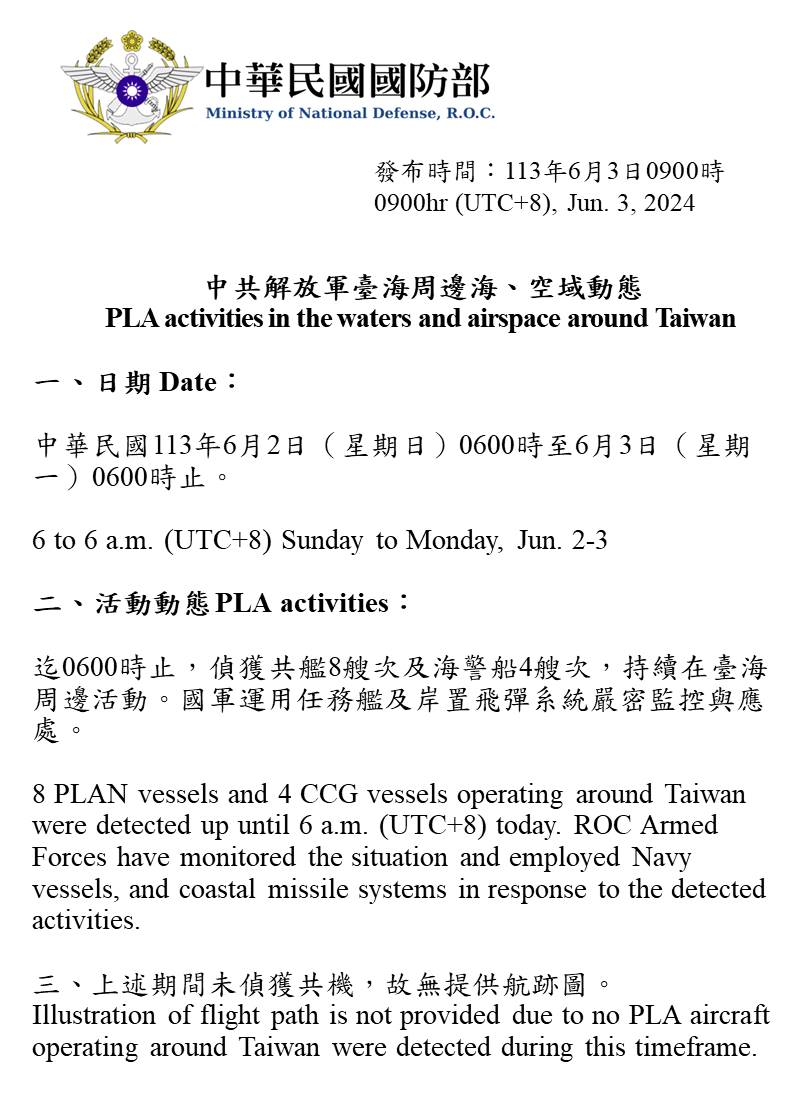 中共解放軍臺海周邊海、空域動態(113年6月3日)