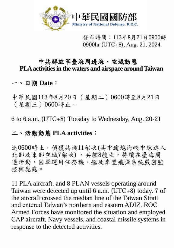 1130821_臺海周邊海、空域活動