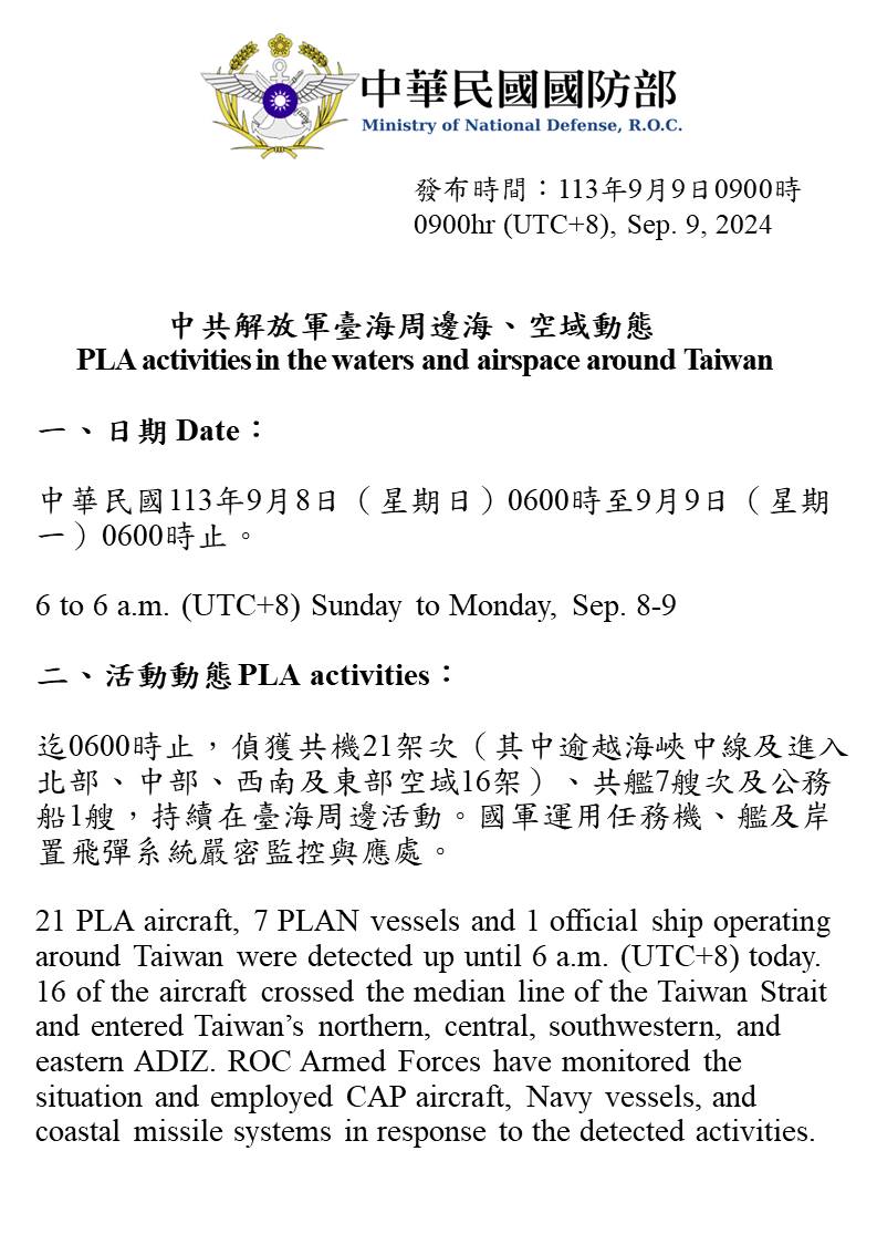1130909_臺海周邊海、空域活動