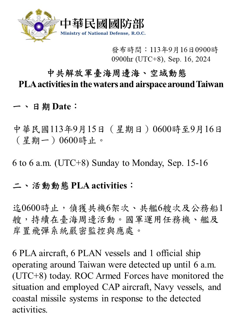 1130916_臺海周邊海、空域活動