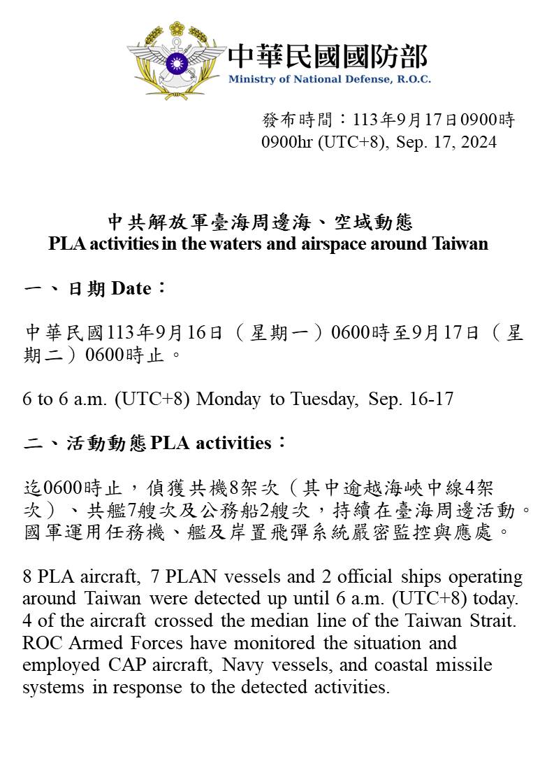 1130917_臺海周邊海、空域活動