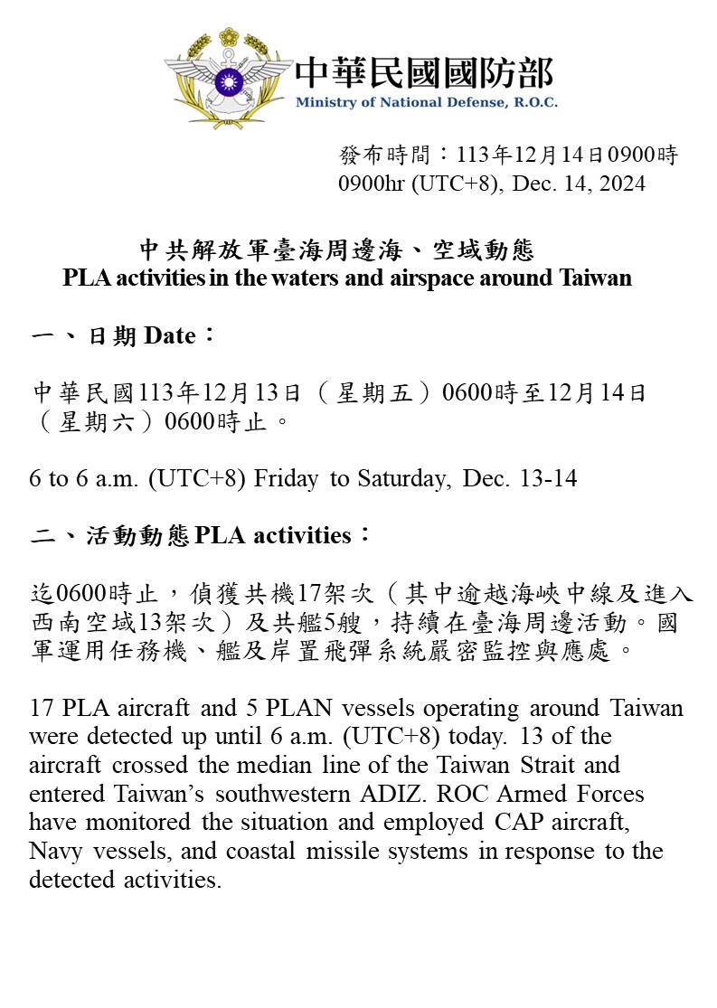 1131214_臺海周邊海、空域活動