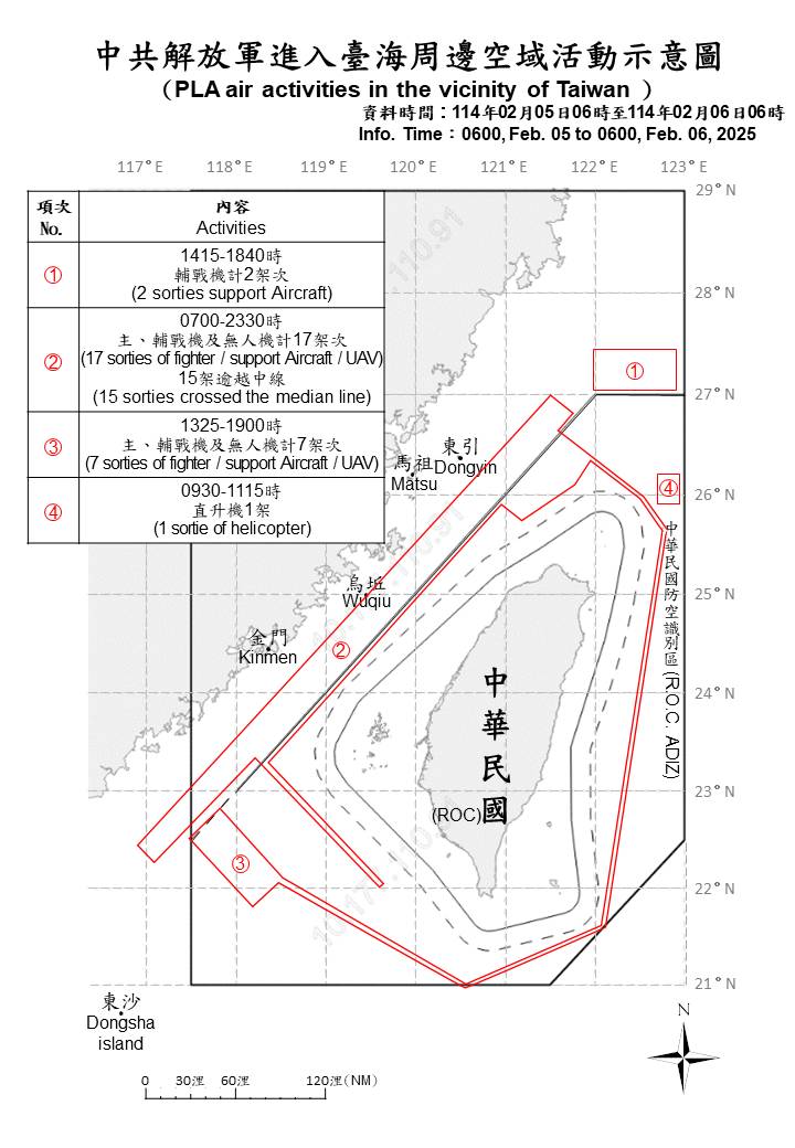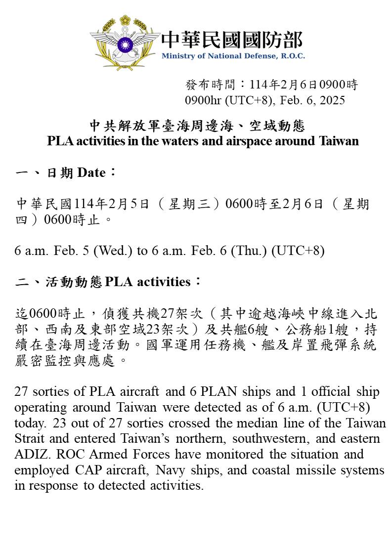 迄0600時止,偵獲共機27架次(其中逾越海峽中線進入北部、西南及東部空域23架次)及共艦6艘、公務船1艘,持續在臺海周邊活動。國軍運用任務機、艦及岸置飛彈系統嚴密監控與應處。