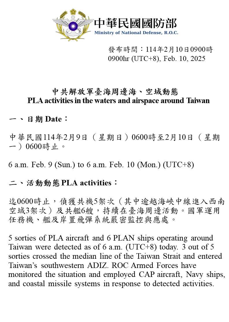 迄0600時止,偵獲共機5架次(其中逾越海峽中線進入西南空域3架次)及共艦6艘,持續在臺海周邊活動。國軍運用任務機、艦及岸置飛彈系統嚴密監控與應處。