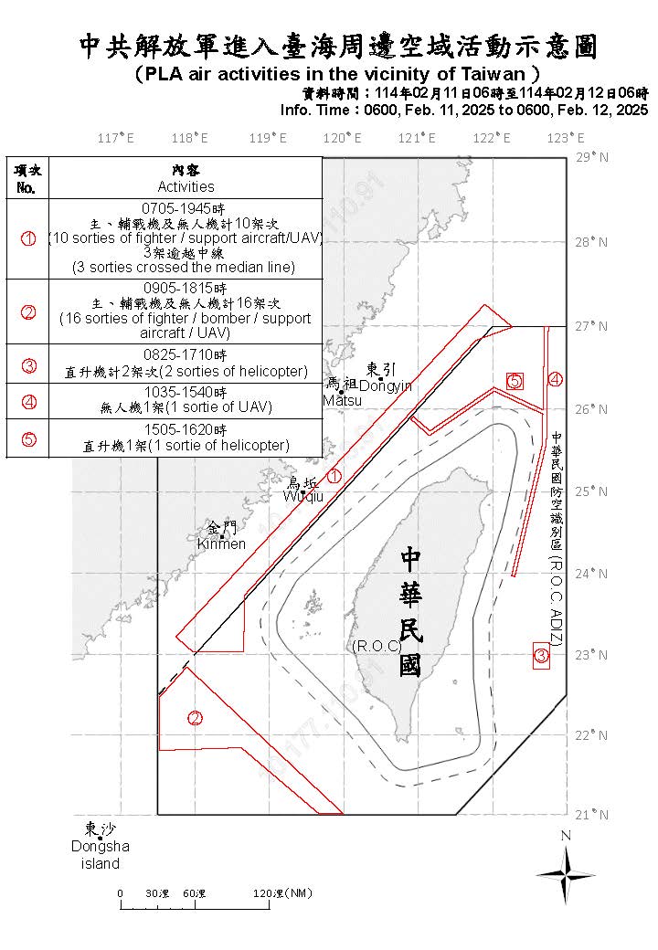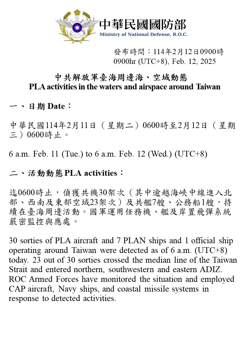 迄0600時止,偵獲共機30架次(其中逾越海峽中線進入北部、西南及東部空域23架次)及共艦7艘、公務船1艘,持續在臺海周邊活動。國軍運用任務機、艦及岸置飛彈系統嚴密監控與應處。