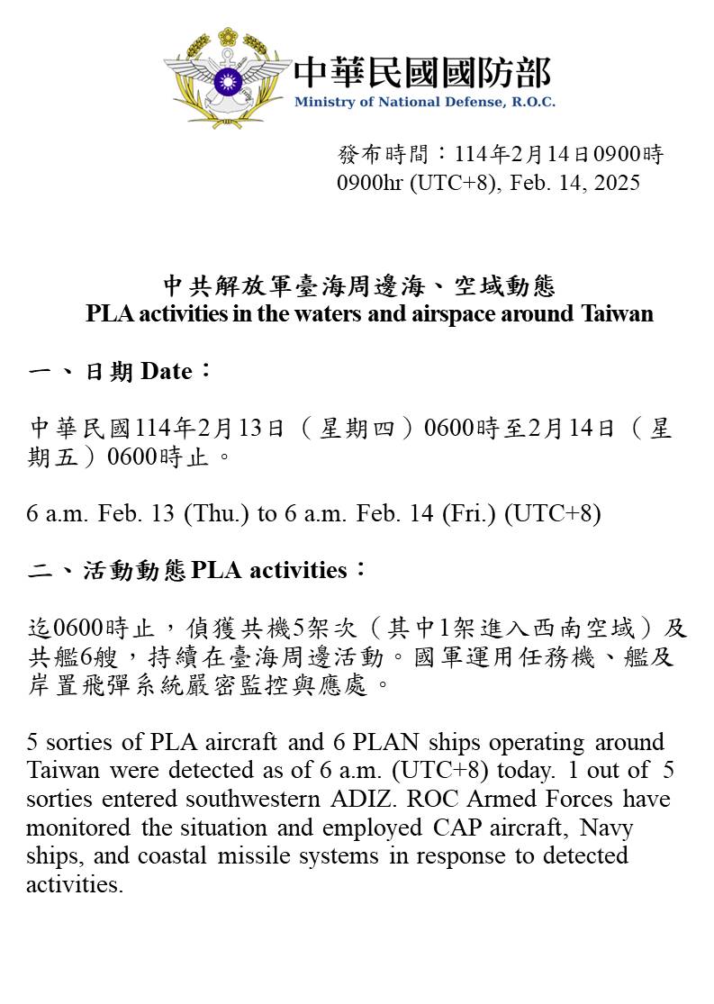 迄0600時止,偵獲共機5架次(其中1架進入西南空域)及共艦6艘,持續在臺海周邊活動。國軍運用任務機、艦及岸置飛彈系統嚴密監控與應處。