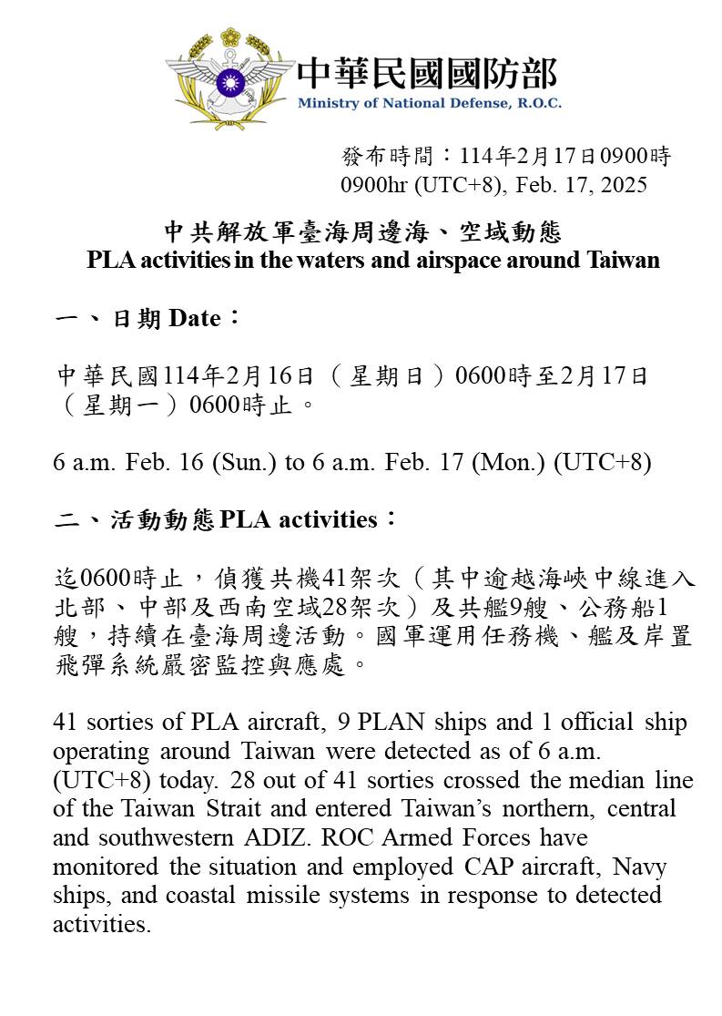 迄0600時止,偵獲共機41架次(其中逾越海峽中線進入北部、中部及西南空域28架次)及共艦9艘、公務船1艘,持續在臺海周邊活動。國軍運用任務機、艦及岸置飛彈系統嚴密監控與應處。