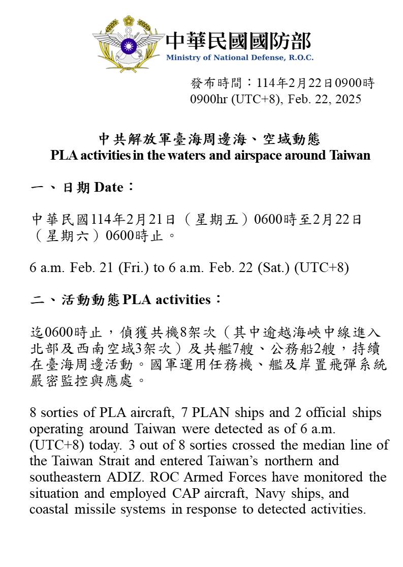 迄0600時止,偵獲共機8架次(其中逾越海峽中線進入北部及西南空域3架次)及共艦7艘、公務船2艘,持續在臺海周邊活動。國軍運用任務機、艦及岸置飛彈系統嚴密監控與應處。