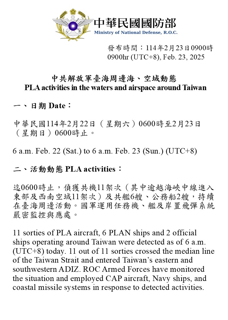 迄0600時止,偵獲共機11架次(其中逾越海峽中線進入東部及西南空域11架次)及共艦6艘、公務船2艘,持續在臺海周邊活動。國軍運用任務機、艦及岸置飛彈系統嚴密監控與應處。