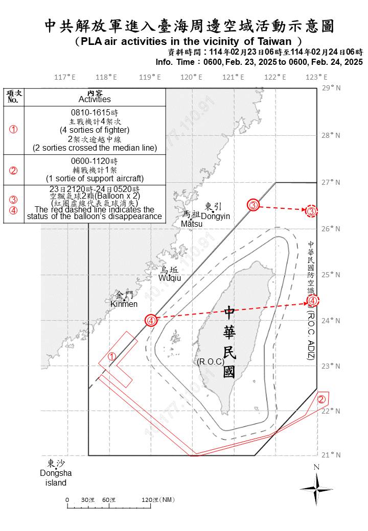 迄0600時止,偵獲共機5架次(其中逾越海峽中線進入西南及東南空域3架次)及共艦10艘、公務船2艘,持續在臺海周邊活動。國軍運用任務機、艦及岸置飛彈系統嚴密監控與應處。