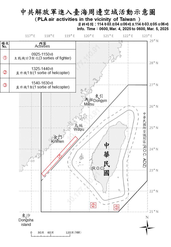迄0600時止,偵獲共機5架次(其中進入南部空域2架次)及共艦7艘、公務船3艘,持續在臺海周邊活動。國軍運用任務機、艦及岸置飛彈系統嚴密監控與應處。