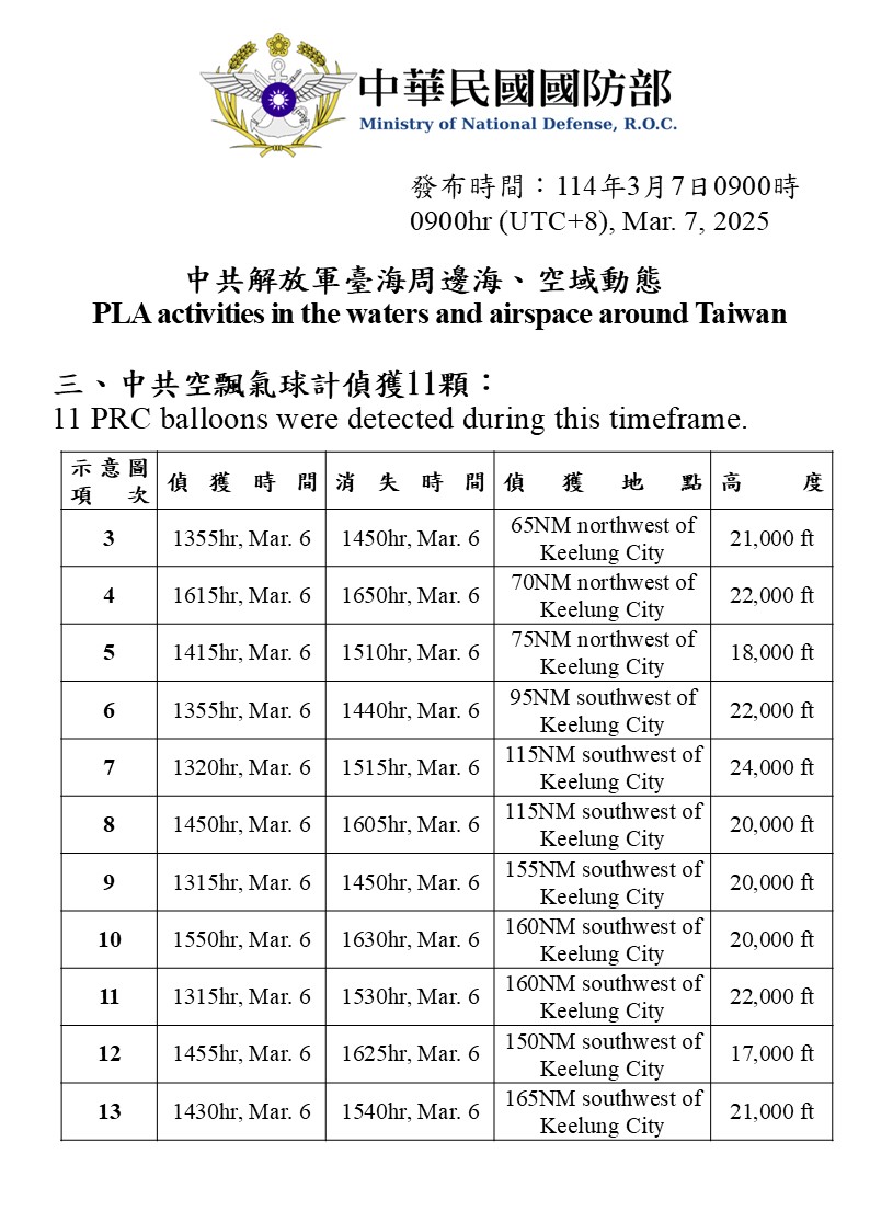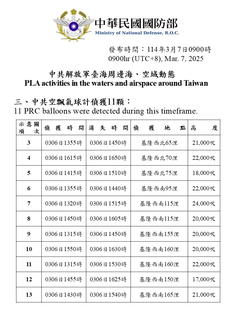 三、中共空飄氣球計偵獲11顆。