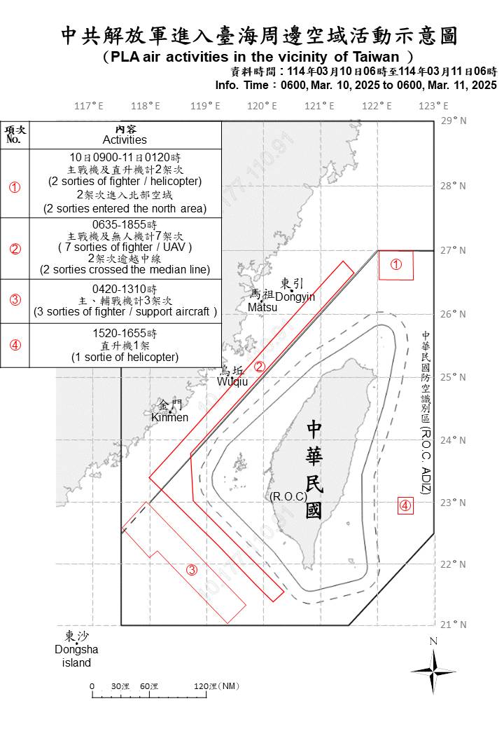迄0600時止,偵獲共機13架次(其中進入北部、西南及東部空域8架次)及共艦7艘,持續在臺海周邊活動。國軍運用任務機、艦及岸置飛彈系統嚴密監控與應處。