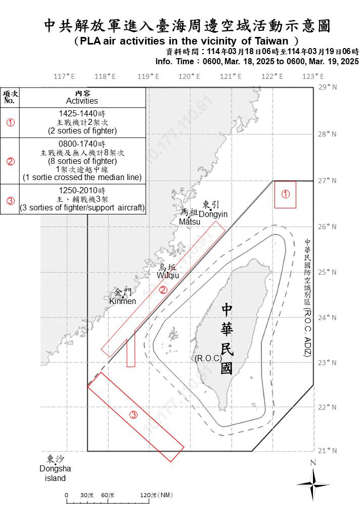 二、活動動態:迄0600時止,偵獲共機13架次(其中逾越海峽中線進入北部及西南空域6架次)及共艦10艘,持續在臺海周邊活動。國軍運用任務機、艦及岸置飛彈系統嚴密監控與應處。