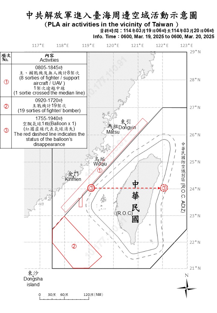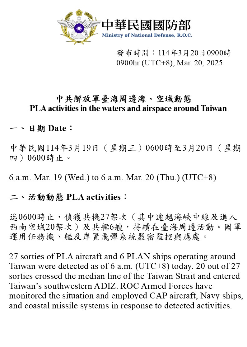 迄0600時止,偵獲共機27架次(其中逾越海峽中線及進入西南空域20架次)及共艦6艘,持續在臺海周邊活動。國軍運用任務機、艦及岸置飛彈系統嚴密監控與應處。