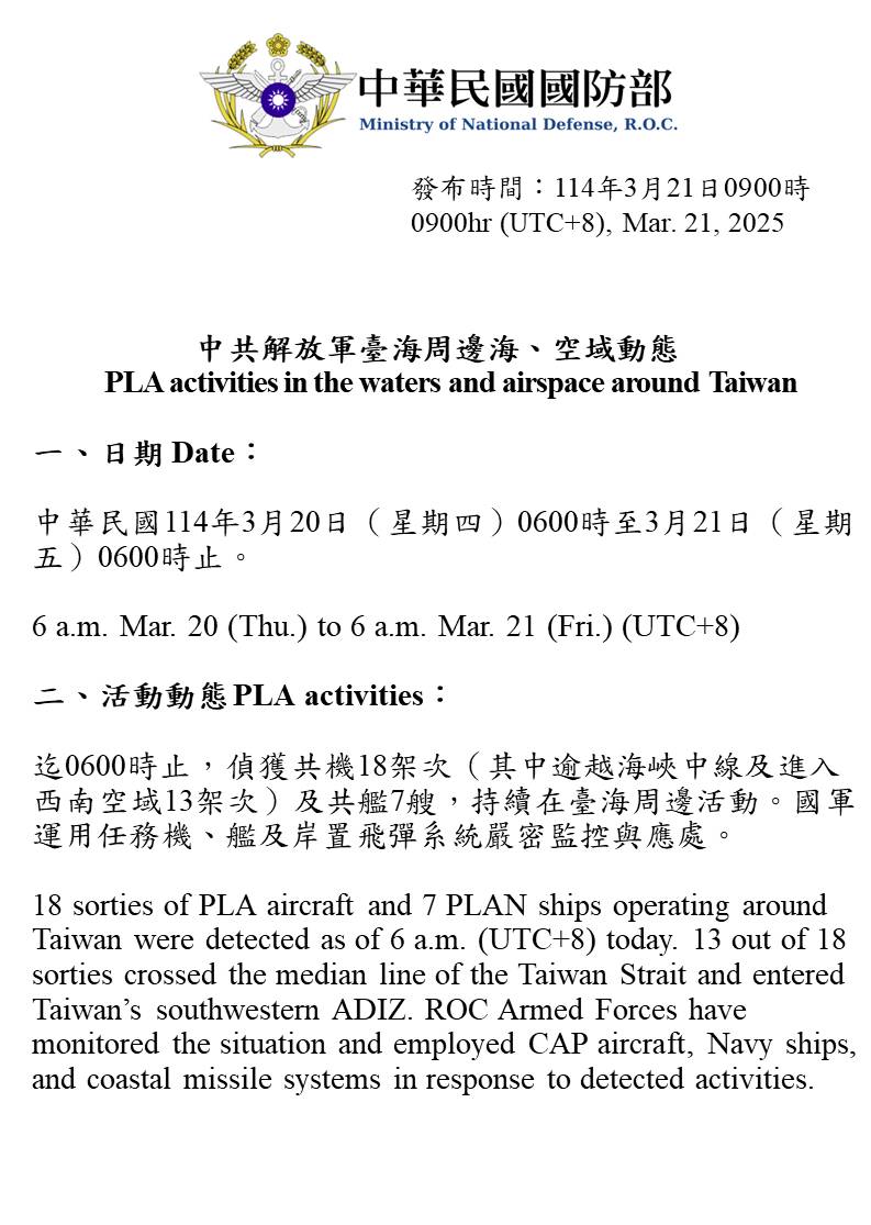 迄0600時止,偵獲共機18架次(其中逾越海峽中線及進入西南空域13架次)及共艦7艘,持續在臺海周邊活動。國軍運用任務機、艦及岸置飛彈系統嚴密監控與應處。