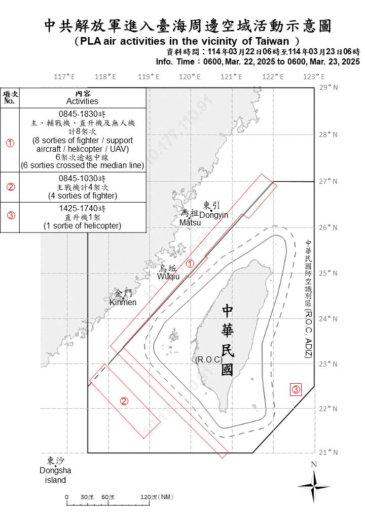 迄0600時止,偵獲共機13架次(其中逾越海峽中線進入北部、西南及東部空域11架次)及共艦8艘、公務船2艘,持續在臺海周邊活動。國軍運用任務機、艦及岸置飛彈系統嚴密監控與應處。