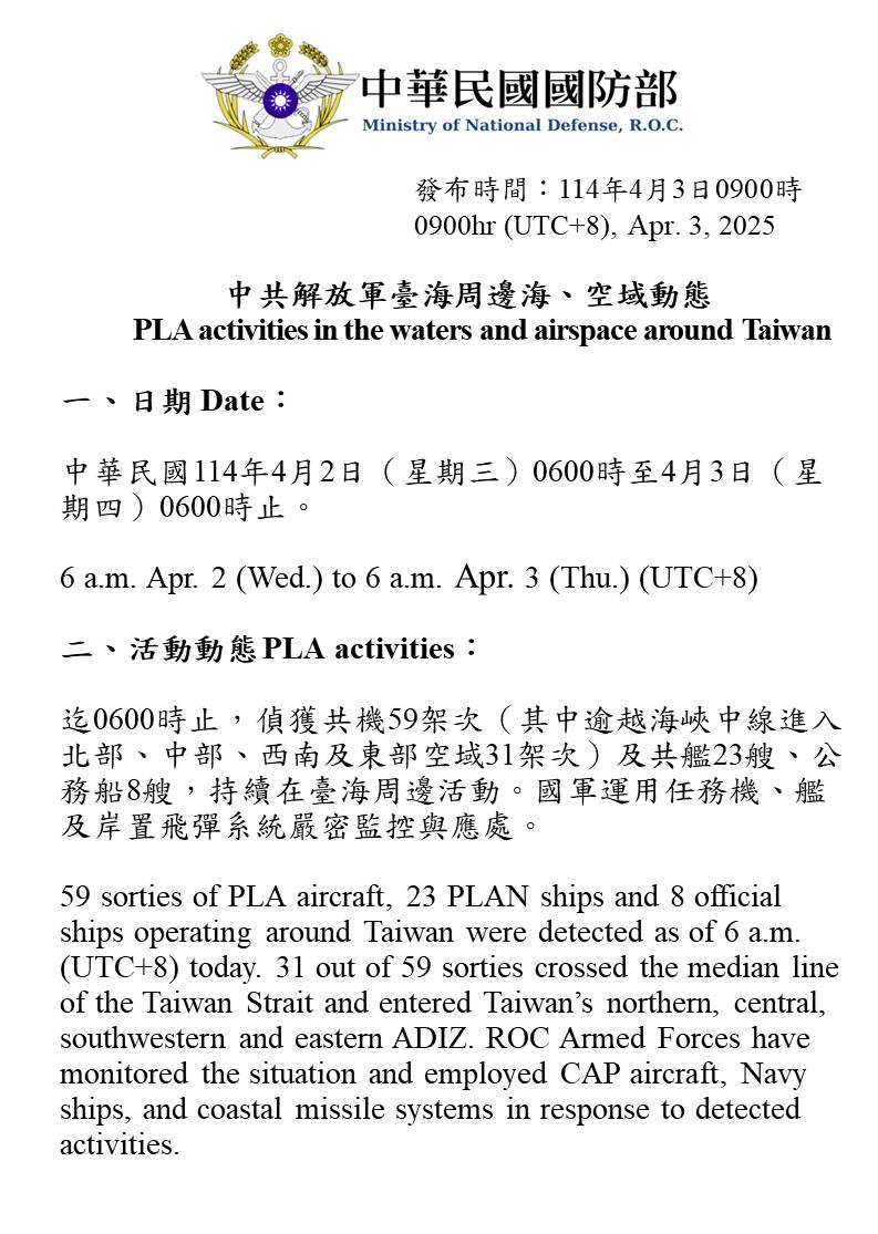 迄0600時止,偵獲共機59架次(其中逾越海峽中線進入北部、中部、西南及東部空域31架次)及共艦23艘、公務船8艘,持續在臺海周邊活動。國軍運用任務機、艦及岸置飛彈系統嚴密監控與應處。
