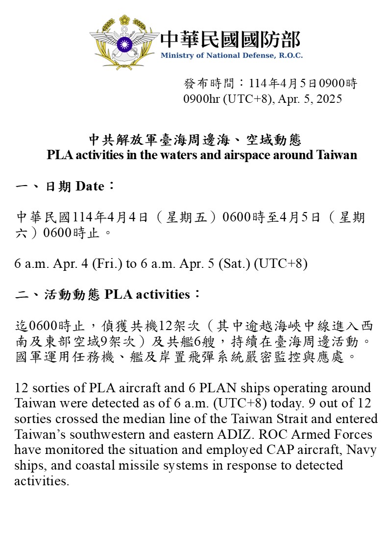 迄0600時止,偵獲共機12架次(其中逾越海峽中線進入西南及東部空域9架次)及共艦6艘,持續在臺海周邊活動。國軍運用任務機、艦及岸置飛彈系統嚴密監控與應處。