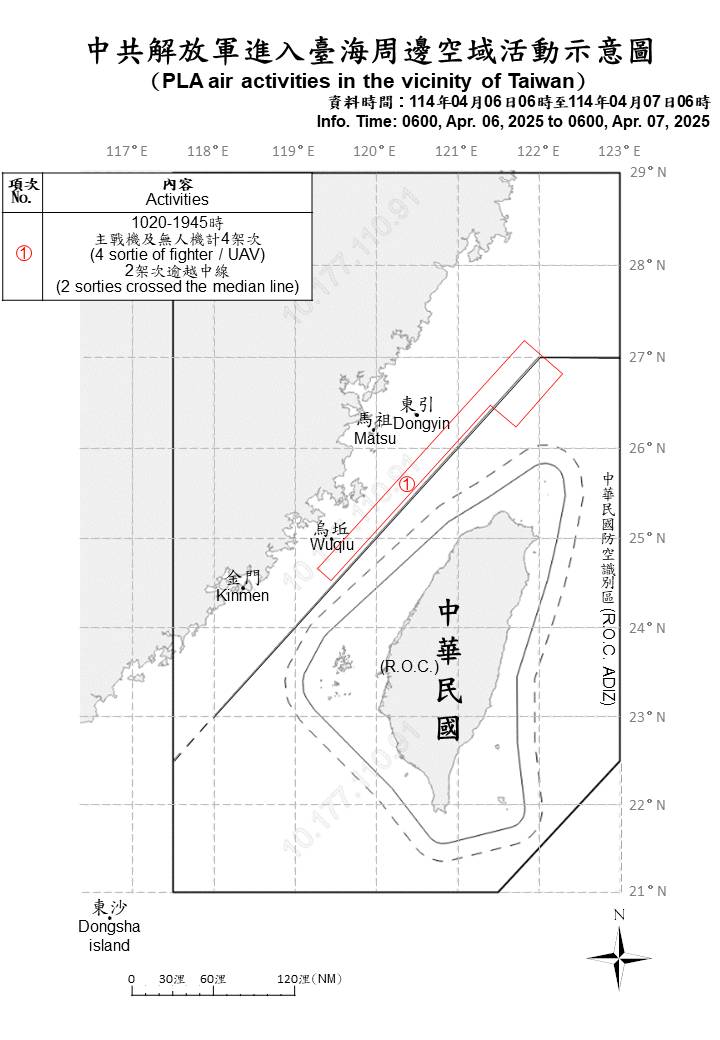 迄0600時止,偵獲共機4架次(其中逾越海峽中線進入北部空域2架次)及共艦8艘,持續在臺海周邊活動。國軍運用任務機、艦及岸置飛彈系統嚴密監控與應處。