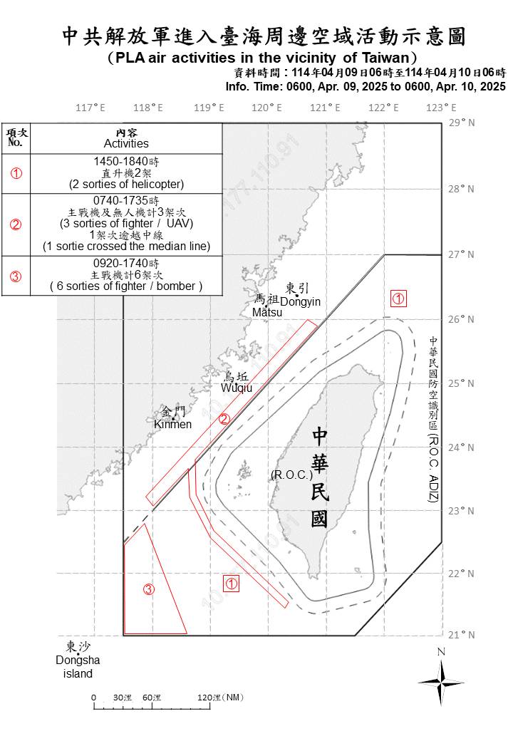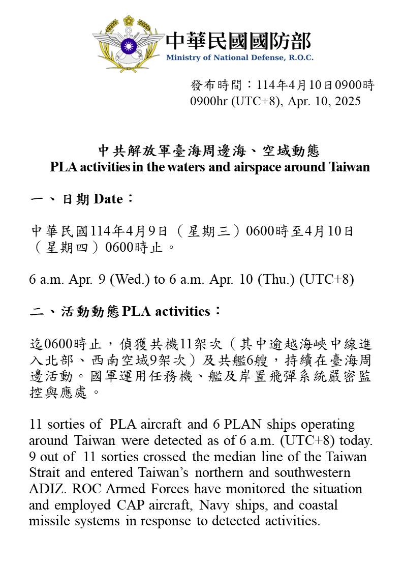 迄0600時止,偵獲共機11架次(其中逾越海峽中線進入北部、西南空域9架次)及共艦6艘,持續在臺海周邊活動。國軍運用任務機、艦及岸置飛彈系統嚴密監控與應處。